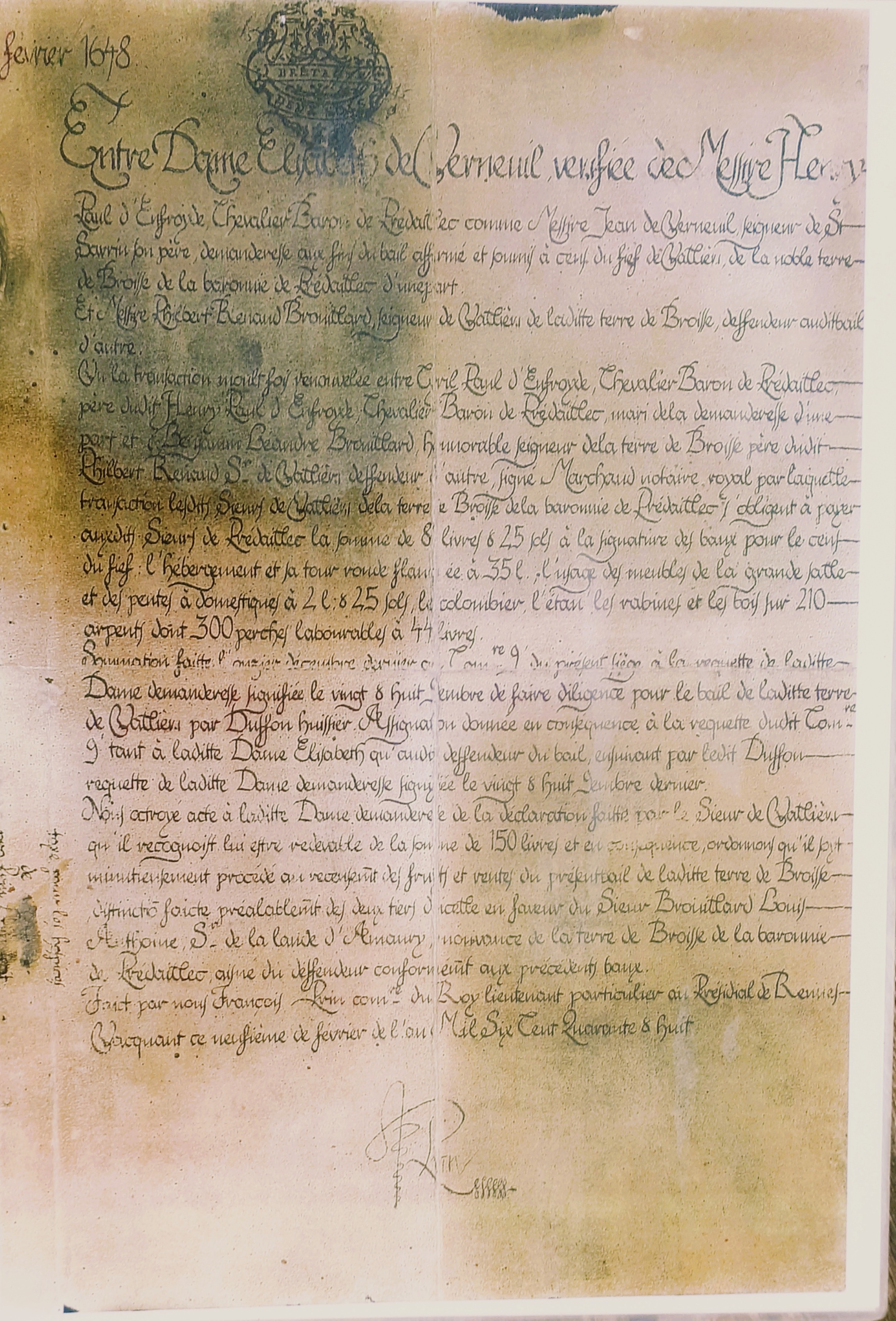 Faict par nous François Prin comʳᵉ du Roy lieutenant particulier au Présidial de Rennes. Vacquant ce neufième de février de l'an Mil Six Cent Quarante & huit. [Signature] Prin