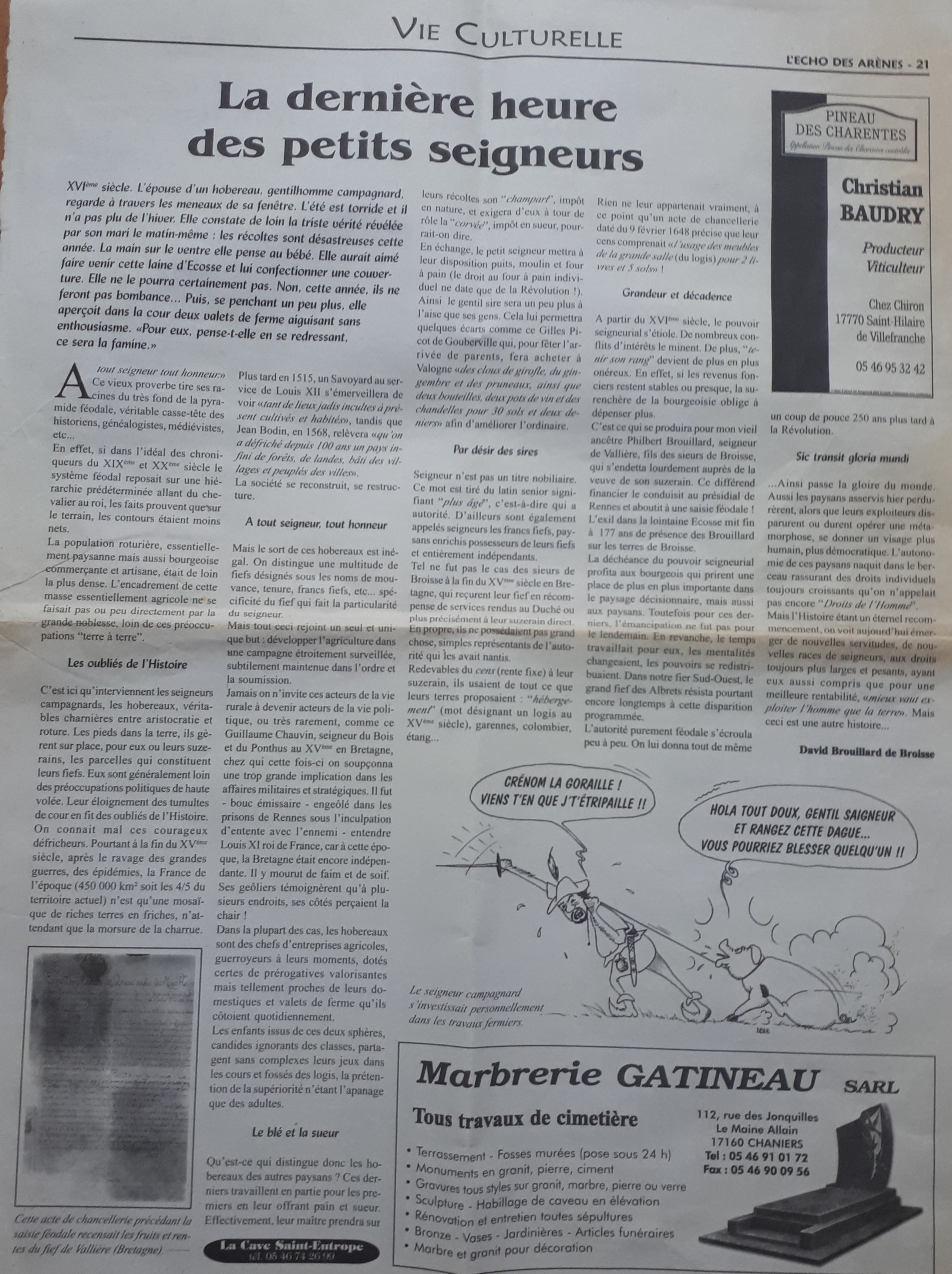 Vu la transaction moult fois renouvelée entre Cyril Paul d'Enfroyde, Chevalier Baron de Prédaillec père dudit Henry Paul d'Enfroyde, Chevalier Baron de Prédaillec, mari de la demanderesse d'une part et Benjamin Léandre Brouillard, honorable seigneur de la terre de Broisse père dudit Philbert Renaud seigneur de Vallière deffendeur d'autre, signé Marchaud notaire royal par laquelle transaction lesdits Sieurs de Vallière de la terre de Broisse de la baronnie de Prédaillec s'obligent à payer auxdits Sieurs de Prédaillec la somme de 81 livres & 25 sols à la signature des baux pour le cens du fief : l'hébergement et sa tour ronde flanquée à 35 l. [livres], l'usage des meubles de la grande salle et des pentes à domestiques à 2 l. & 25 sols, le colombier, l'étan, les rabines et les bois sur 210 arpents dont 300 perches labourables à 44 livres.